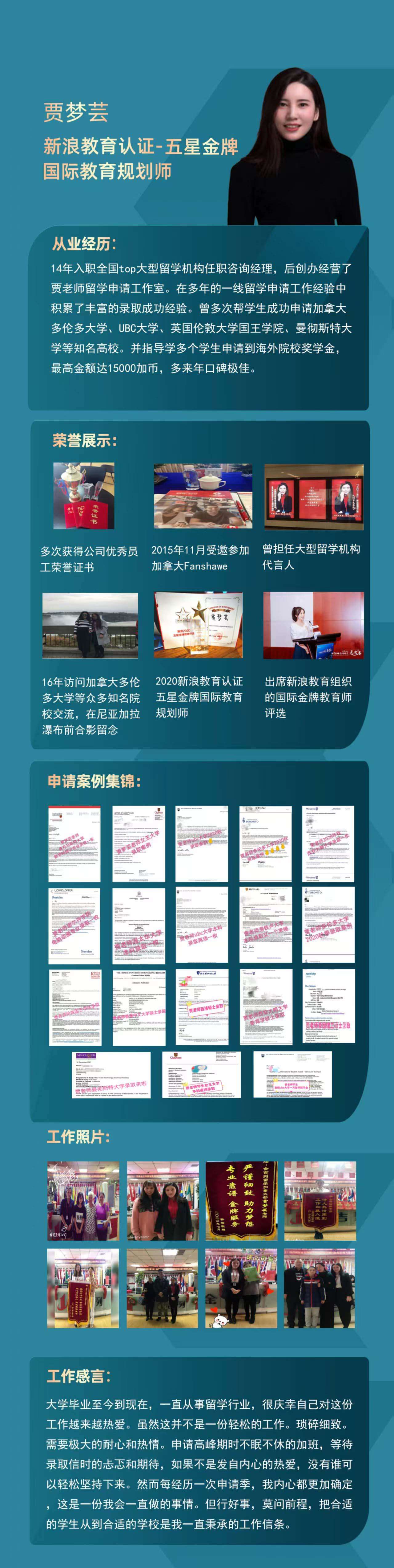 专业从事留学申请多年,曾在全国top留学机构任职咨询经理,后创办了自己的留学申请工作室。在多年的一线留学申请工作中积累了丰富的录取成功经验。多次帮学生成功申请加拿大多伦多大学、UBC大学、英国伦敦大学国王学院、曼彻斯特大学等知名高校。并指导学多个学生申请到海外院校奖学金,金额高达15000加币,多来年口碑好。2015年出访加拿大Fan-shawe College云南峰会,2016年出访加拿大多伦多大学、渥太华大学、女王大学等众多知名院校。2020年荣获新浪五星国际教育规划师称号。